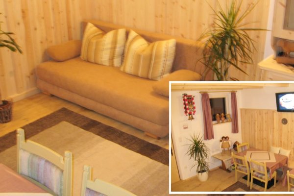 - Living room with dining table, corner seat, pull-out sofa, satellite TV, radio
